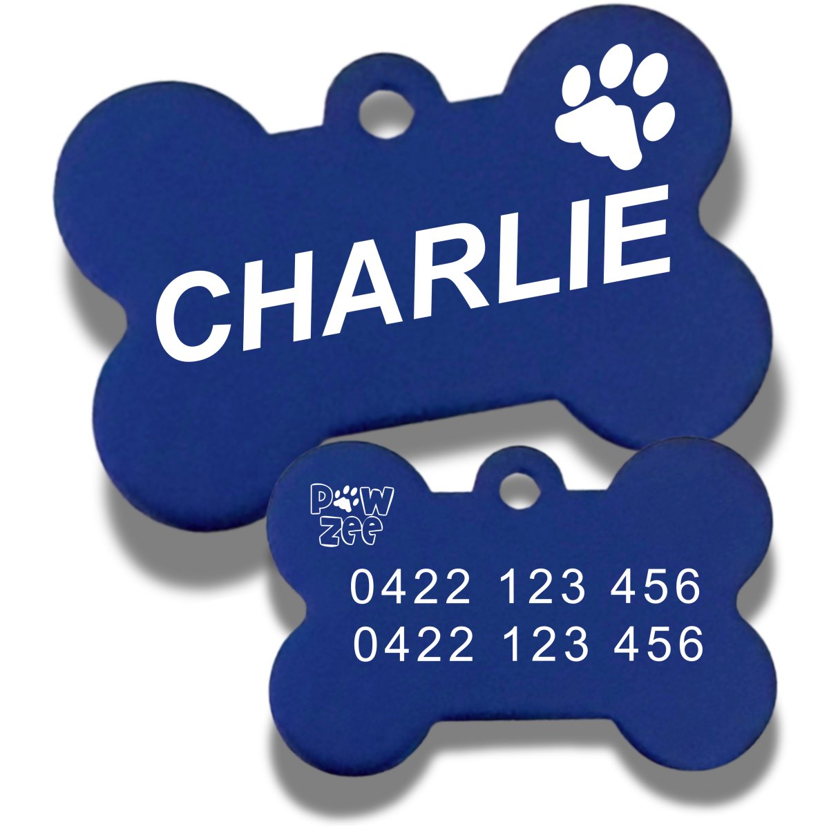 Engraved Dark Blue Pawzee Light Aluminium Dog Tags for dogs and cats are made in Australia from light weight aluminium and come personalised with your pets name in a LARGE BOLD FONT that stands out along with a cute paw print on the front and your contact details BIG and CLEAR on the back!